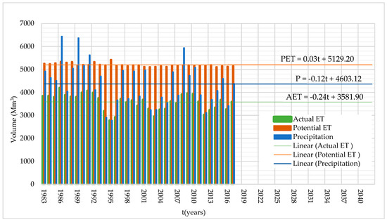 The model shows that the major component of water inflow into the catchment is precipitation (Figure 10). The observed trend for a period of 34 years shows that precipitation is decreasing at a rate of 0.12 Mm3/year. This decrease agrees with the findings in the study by Chisola et al. [28] in which the decrease was attributed to climate change.
