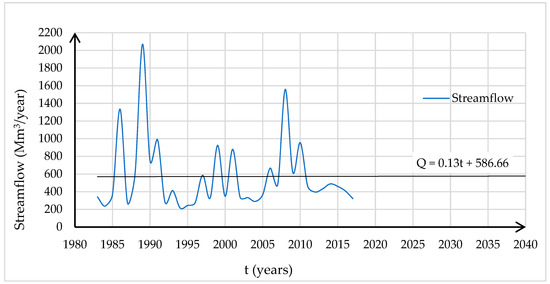 During the period under study, the WEAP Model simulated average streamflow was 10.32 m3/s. The minimum streamflow volume was 1.01 Mm3 in September and the maximum streamflow volume was 79.68 Mm3 in February. The trend indicates that on average annual streamflow at the outlet has increased at a rate of 0.13 Mm3 per annum (Figure 7).