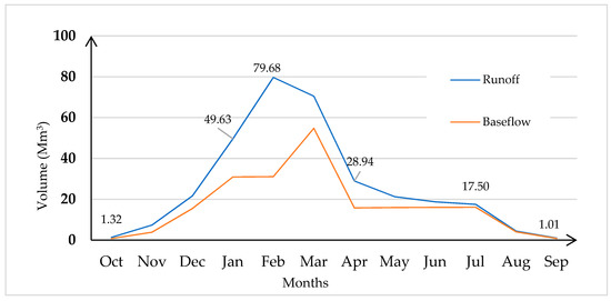 The WEAP Model simulated average annual baseflow at the outlet of the Chongwe River catchment was 205.57 Mm3. The minimum baseflow volume was 0.77 Mm3 in October and the maximum baseflow volume was 54.76 Mm3 in March. Figure 8 presents the monthly streamflow and baseflow of the Chongwe River catchment during the period under study.