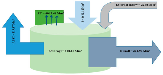 where, P = precipitation (Mm3/year), = external inflow from other catchments (Mm3/year), ET = actual evapotranspiration (Mm3/year), = streamflow (Mm3/year), ABST = abstraction (Mm3/year), ∆S = change in storage (Mm3/year).