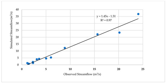 The graphical comparison of the monthly average observed streamflow with the simulated streamflow for a period from 1982/83 to 2016/17 are presented in Figure 11. The model fit was assessed using the coefficient of determination (R2) (Figure 12) and Nash–Sutcliffe model efficiency coefficient (NSE). From the comparison, an R2 of 0.97 and NSE of 0.64 were achieved. Computation of NSE is shown in Table S1 under the Supplementary Materials.