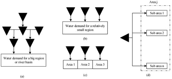 The proposed model is based on a water supply layout that is typical for most areas with multiple reservoirs. In such areas, large reservoirs are often constructed, and these are either mixed-connected (Figure 1a)—that is, they are used in a large river basin—or they are in parallel (Figure 1b)—that is, they are usually applied only in a relatively small region []. This paper mainly discusses the latter scenario. Parallel reservoirs are normally individual units, and each big reservoir supplies water for a certain part of the region (Figure 1c). In addition, the water supply area is complicated, because it has many rivers with complex relationships, and a great number of water users. An area is often separated into several sub-areas, each of which manifests a complex relationship with the upstream and downstream of the river and its tributaries and streams, rather than being mutually independent. Large reservoirs supply water for a certain area, which is composed of sub-areas that can be regarded as an integer, thus comprising a large complex system of water resources (Figure 1d).