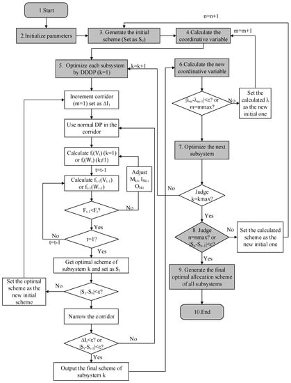Step 5: Begin the main method. In this step, the large system is divided into subsystems, and each subsystem is optimized by DDDP; set m = 1, where m is the iteration number of the kth subsystem. The optimization process is within the given width of the corridor by normal DP using the inverse sequence method to obtain the new allocation scheme and narrow the corridor. If the error-adjacent iteration of the allocation is less than ε, then go to the next step; otherwise, repeat this step, and set m = m + 1.