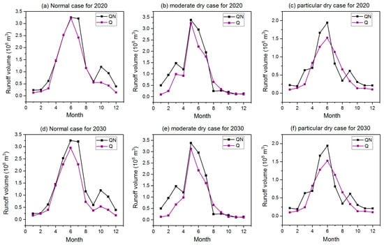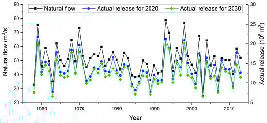 As can be seen in Figure 5, the long serial change of natural flow and the actual release for both 2020 and 2030 are almost the same. According to Bunn et al. (2002) [] and Yin et al. (2010) [], this changing trend between natural flow and reservoir release expressed in Figure 5 indicates that the long serial reservoir release of both scenarios is beneficial for protecting the ecosystem of the river. When it comes to the difference between these two items, there still exists a gap, but it is not enough to deteriorate the ecological environment. The gap occurs because the natural flow is not only used entirely to maintain the riverine ecosystem, but is also used to satisfy socio-economic needs. To further illustrate the trend of natural flow and actual release, we selected three typical yearly runoff series from the long serial runoff data to analyze the annual distribution of the actual release (Figure 6 and Table 2). It can be seen from Figure 6 that the changing trends of the annual distribution of reservoir release and natural flow are also almost the same. It should be noted that there is no obvious decrease in actual in particularly dry years, because the amount of reservoir release in particularly dry years is equal to the basic flow in both scenarios.