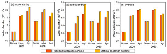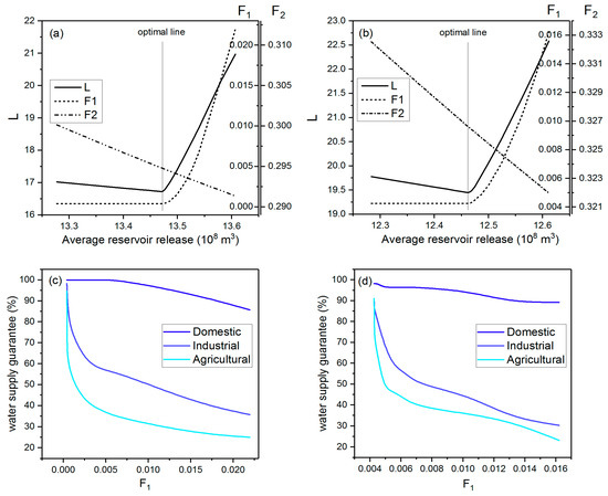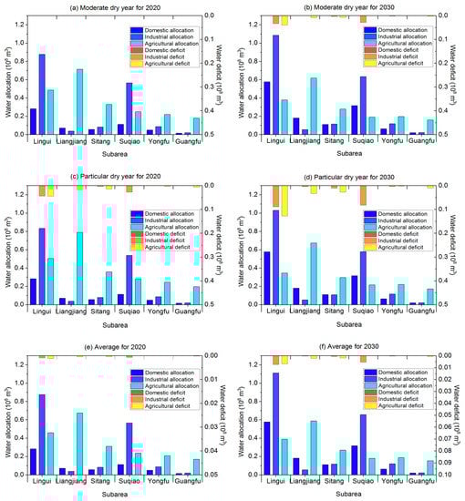 The local water for the sub-areas, including the water intake from rivers and small reservoirs, is of higher priority than the large reservoirs for all sub-areas. Domestic water supply has higher priority than that for industrial and agricultural purposes [], and the relative priority of these groups of water users should be balanced [].