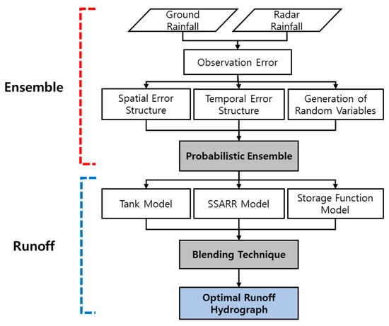 Figure 1 shows a diagram of the study. We created probabilistic rainfall ensembles using ground and radar data to determine the uncertainty because radar rainfall data have spatiotemporal errors. The generated rainfall ensembles were used as input data for three runoff models to perform a runoff analysis. The runoff results differ among runoff models, even though the same input data are used, because of the difference in model structures and assumptions of each runoff model. Therefore, we applied blending techniques to reduce the uncertainty and calculated the optimal runoff hydrograph.