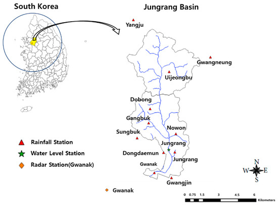 The Jungrang Basin is located in the central metropolitan area of the Korean Peninsula and was selected as the target watershed. Jungrang Basin is located in the lower part of the Han River, and there are many rainfall stations. Thus, it is easy to compare the rainfall data of stations with the radar rainfall data and generate ensembles. The watershed area of Jungrang Basin is 299.60 km2 and the watershed length is 32.80 km. The average width and altitude of the watershed are 8.1 km and EL. 107.2 m, respectively. Jungrang Basin is next to a major urban river and a highly populated area with a high potential risk of flooding.