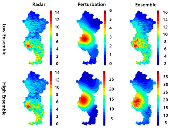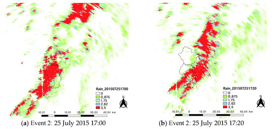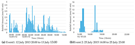 Accumulated rainfall for each rainfall event is shown in Figure 3. Event 1 shows a continuous rainfall pattern with a low intensity of less than 5 mm and Event 2 shows a rainfall pattern with a high intensity of more than 10 mm in a short time. Figure 4 shows the movement of rainfall in the northeast direction. In the case of localized rainfall, such as Event 2, the ground observation station can’t know the spatiotemporal characteristics of rainfall and the radar has the disadvantage of underestimating the rainfall. Therefore, in this study, we try to know the spatiotemporal characteristics of rainfall by generating a rainfall ensemble.