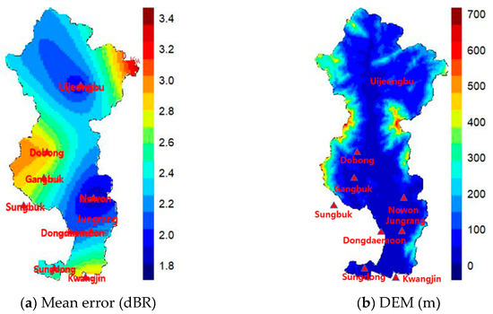 The mean errors of observation stations are in the range of 1.808–3.354 dBR, and the radar rainfall is underestimated at all observation points. In particular, relatively large observation errors exceeding 2.7 dBR were calculated at the Uijeongbu, Dobong, and Sungbuk observation stations. When comparing these stations with the digital elevation models (DEM) of Jungrang Basin (Figure 5b), the observation errors were high in high-altitude areas. At low-altitude sites along the stream (Gangbuk, Nowon, and Jungrang), the observation error was relatively low (less than 2.2 dBR). Dobong and Gangbuk observation stations have a low altitude, but there are more than 500 m of mountain area on the left side. As a result, the radar rainfall was underestimated and the mean error was estimated to be relatively high at about 2.93 dBR. It was considered that the radar rainfall underestimated the actual rainfall due to the mountain effect.