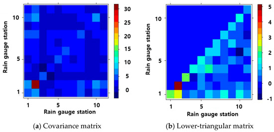 To generate a perturbation () using Equation (9), the covariance must be estimated. We obtained the covariance matrix between observation stations using Equations (4) and (5), and the results are shown in Figure 6. Figure 6a indicates the matrix generated from the estimation of the covariance among stations. Since the upper and lower sides of the diagonal line are symmetric matrices with the same value, the lower triangular matrix was produced by Cholesky decomposition, as shown in Figure 6b.