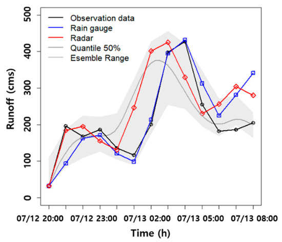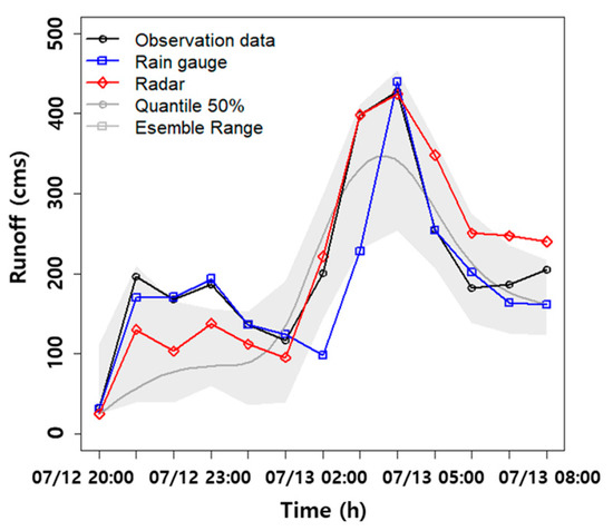 - A runoff analysis was performed to confirm the uncertainty of the runoff models by using station rainfall data, radar rainfall data, and ensemble rainfall data in the tank model, SSARR model, and the storage function model. Even with the same rainfall data, the runoff results of the models were all different, which confirmed the uncertainty of the runoff models;