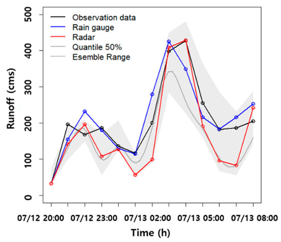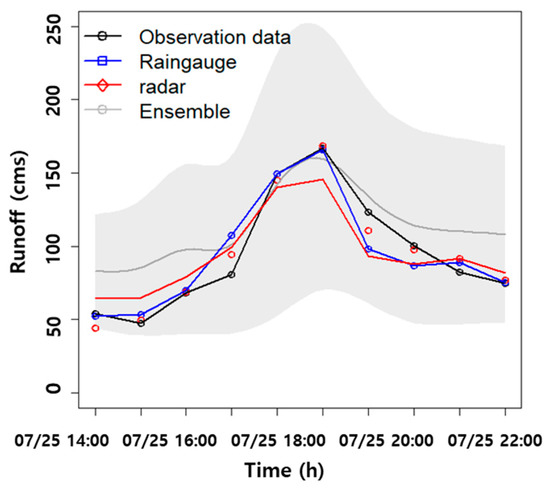 The accuracy of the rainfall ensembles and the blending techniques was evaluated by applying different rainfall events. The events from 14:00 to 23:00 on 25 July 2015 were selected for the verification, and the results are shown in Figure 16. During the verification event, the MMSE method again showed the best result with an error of 7.03–9.46%, and the MSE method showed high uncertainty of 11.31–46.93%. This confirms that the results of the hydrologic models simulated the observed runoff well when the rainfall ensembles and the blending techniques were applied.