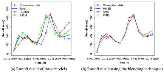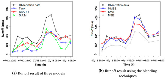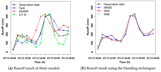 The runoff simulation results of all three models varied from model to model, even though the same rainfall data were used. Figure 11, Figure 12, Figure 13 and Figure 14 show the results with the blending techniques after integrating the runoff results of the models. Figure 11a, Figure 12a, Figure 13a and Figure 14a show the runoff results of the models using the ground rainfall, radar rainfall, the maximum ensemble, and the minimum ensemble. Figure 11b, Figure 12b, Figure 13b and Figure 14b show the runoff results in a single runoff curve, which are obtained by applying the three blending techniques, using the runoff results of the three hydrologic models as input data. The results of the blended runoff for each rainfall data reflect the observed runoff quite well.
