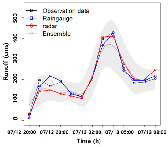 Table 5 and Table 6 show the results of using the minimum and maximum rainfall ensemble data. The ensemble rainfall data indicate the level of uncertainty of rainfall. However, the blending technique is used to reduce the uncertainty, based on the observed runoff data. When the ensemble rainfall data are applied to the blending technique, the uncertainty of the rainfall disappears. Therefore, instead of using the MMSE blending technique with the lowest error, we used the MSE blending technique with the highest error as the optimum blending runoff hydrograph for the ensemble rainfall data to express the uncertainty of ensemble rainfall. The optimal blending technique for each rainfall data is summarized in Figure 15. The runoff curves for all three rainfall data are close to the observed runoff.
