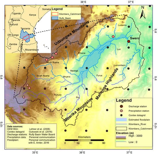 The Kilombero Catchment is part of the Rufiji basin, which forms the largest river basin in Tanzania (Figure 1). The catchment is situated in the Morogoro region in southern Tanzania and comprises 40,240 km2 until its confluence with the Rufiji River. The Udzungwa Mountains in the north, with elevation ranging up to 2500 m, as well as the Mbarika Mountains and the Mahenge Highlands in the south, demarcate the border of the catchment. The Kilombero River itself receives perennial inflow mainly from the Udzungwa Mountains forming a seasonal floodplain at around 200 m above sea level (Figure 1). The floodplain itself covers an area of 7967 km2 [12], representing the biggest freshwater wetland in East Africa below 300 m above sea level [12], and is listed as an endangered Ramsar site [14]. Intensive mountainous rainfall in combination with year-round groundwater supply [23] ensure a contribution of 62% of the annual runoff volume of the Rufiji River, although the Kilombero Catchment covers only 23% of the drainage area [14].