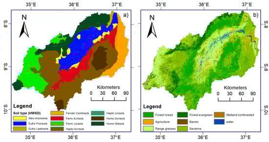 Soil map (a) and land use and land cover (LULC) map (b) of the study area. The distribution of soils is derived from the Harmonized World Soil Database (HWSD) [42] and the LULC map shows the LULC distribution derived from Landsat Level 1 images from 1970 (modified after Näschen et al. [23] and Leemhuis et al. [22]).