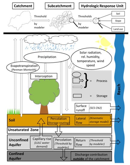 Catchment discretization and schematic overview of processes and storages simulated by the SWAT model. Applied methods to simulate evapotranspiration and water fluxes are shown in parentheses (modified after Neitsch et al. [52]).