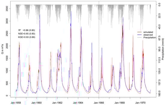 Hydrograph showing the observed and the simulated discharge for the calibration (1958–1965) and the validation period (1966–1970), separated by the dashed vertical line. Statistical measures are shown within the graph and refer to the coefficient of determination (R2, Equation (1)), the Nash-Sutcliffe efficiency (NSE, Equation (2)) and the Kling-Gupta efficiency (KGE, Equation (3)). The values in the parentheses refer to the validation period (modified Figure after Näschen et al. [23]).