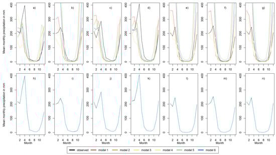 Average monthly precipitation from 1951–2005 for the seven datagrids of CORDEX Africa before bias-correction in (a–g) and for the same stations after bias correction in (h–n). The lines representing the precipitation for the observed precipitation, as well as for models 1 to 5, are superimposed by the lines for model 6 due to their similar precipitation after bias correction (h–n). Each graph shows the average monthly precipitation for all six models introduced in Table 2.