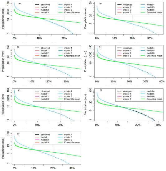 Furthermore, the exceedance probabilities for all stations and models were analyzed (Figure 6), demonstrating a good performance of the bias-correction with regard to the cumulative distribution of rainfall events. The ensemble mean of the six models is also shown here with a completely different distribution of the ranked rainfall events, revealing a high amount of rainfall events below 10 mm, but much less events with 10 mm or more rainfall, compared to all the single model results. However, the temporal distribution of the daily rainfall patterns still varies among the observed precipitation and each single CORDEX model, apart from this ranked illustration.