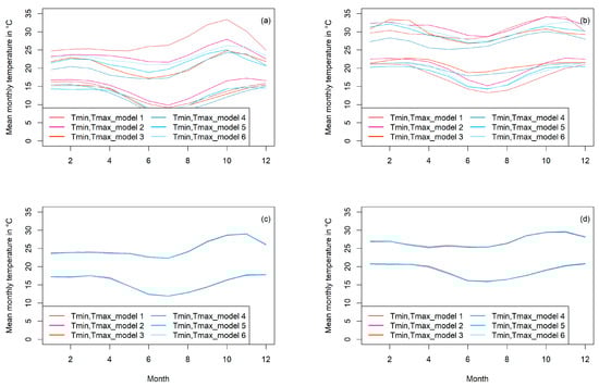 Mean monthly minimum and maximum temperatures from 1979 to 2005 for two exemplary stations out of the 21 utilized CORDEX Africa datagrids before and after bias-correction. (a,b) Temperatures before bias correction. (c,d) The same stations after bias-correction. Each graph shows the average Tmin and Tmax monthly temperature for all six models introduced in Table 2. (c,d) The last plotted lines from model 6 superimposed over the other models’ lines due to their similarity after bias correction. All 21 stations can be found in the appendix before (Figure A1) and after bias-correction (Figure A2).