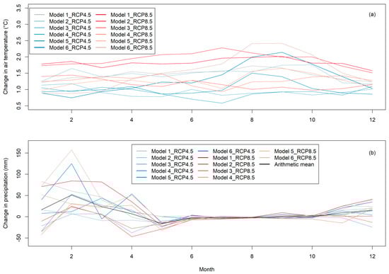 Two of the most important and commonly utilized climate parameters with regard to hydrological modeling of climate change impacts are precipitation and temperature. Figure 8 displays the climate change signal of both parameters for all six RCMs by comparing the bias-corrected historical model runs with the bias-corrected projections based on the RCP scenarios in a monthly time resolution. The temperature signal (Figure 8a) generally shows a clear trend of rising temperatures between 0.5 and 2.5 °C, with the highest increase in August and September. Furthermore, the chart indicates a higher increase in the results based on the RCP8.5 projections, although model 1 and model 2, based on RCP4.5, simulate higher temperatures compared to several RCP8.5 based modeling results. Nevertheless, all model projections, except for model 6 in RCP8.5, show a constant increase of temperature throughout the year, whereas model 6 in RCP8.5 reveals an increase of less than 1 °C in January and the highest increase of about 2.5 °C in August and September, indicating the strong impact of the RCP scenarios on temperature in the dry season.