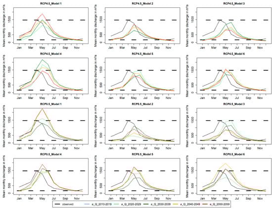 A more detailed overview of discharge behavior in the single models and RCP scenarios is given in Figure 9 by displaying the average intra-annual discharge for the single decades from 2010 to 2060. A comparison of the single decades across the six models and two RCP scenarios displays various decades as either dry or wet. Hence, a clear signal for the discharge pattern over time is not obtained. Nevertheless, Figure 9 shows a shift of the discharge peak from April to May for all the models, except for model 3, with a shift of the peak to June, from 2020 onwards.
