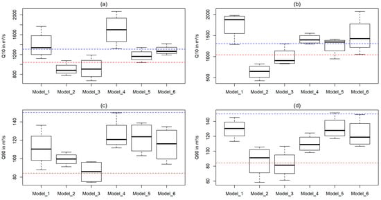 Boxplots showing the distribution of Q10 (a,b) and Q90 (c,d), representing the flow exceeded in 10% or 90% of the time for Q10 and Q90, respectively. The data in the left columns (a,c) is based on the model runs within the RCP4.5 scenario from 2010 to 2060, whereas the right columns display the modeling results within the RCP8.5 scenario. The dashed blue lines represent the measured historical Q10 and Q90 from 1958 to 1970 and the dashed red line represent the modeled historical Q10 and Q90 according to CORDEX Africa from 1951 to 2005, respectively.