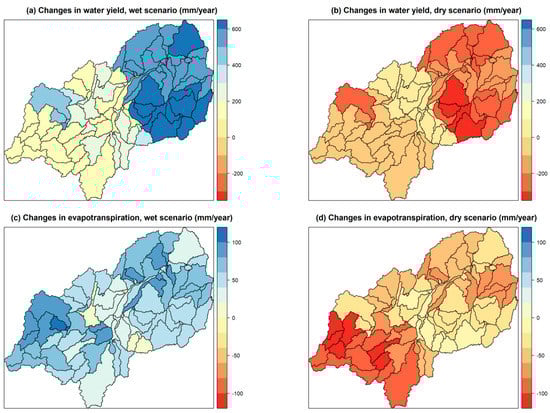 The impact of the RCMs and the applied RCP scenarios on selected water balance components is shown in Table 4. The changes in precipitation indicate a dryer future according to models 2, 3, and 4, although there is a high variation with regard to these three RCMs and the two RCP scenarios, with deviations in precipitation from +22 to −109 mm per year. The projected wetter future is more consistent and pronounced with regard to models 1, 5, and 6, especially in the RCP8.5 scenario, with an annual average increase of up to 302 mm in model 6. Also, the ensemble mean scenario projects 68 mm (RCP4.5) or 88 mm additional rainfall in both RCP scenarios. The actual evapotranspiration ET0 and the water yield are also closely linked to the precipitation trends, including the surface runoff (Table 4). Hence, the trends are similar; nevertheless, the magnitude differs and is in generally more pronounced for changes in water yield in contrast to changes in ET0. The potential evapotranspiration ETp is increasing in all RCMs by 43 mm up to 136 mm.