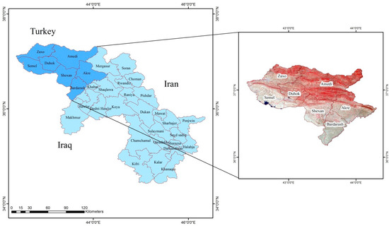 An illustration of the location of the study area. Light blue area is the Kurdistan Region and blue is study area.