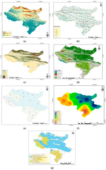 (a) Digital elevation model; (b) Drainage area; (c) Slope; (d) Classified land use; (e) Soil classes (B: Silt loams or loamy soils (0.38 to 0.76 cm/h), C: sandy clay loams (0.13 to 0.38 cm/h), D: high runoff potential soils (0 to 0.13 cm/h)); (f) Average annual rainfall; (g) Soil types.