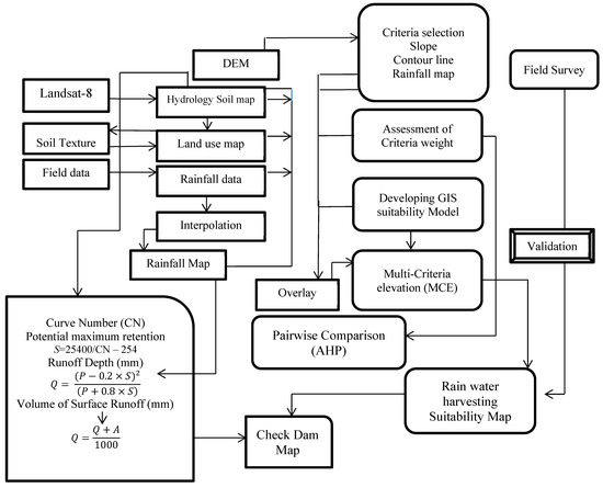 Flowchart for generation rain water harvesting mapping, Qv is the volume of surface runoff (mm3), Q is the runoff depth (mm) and A is the basin area (km2).