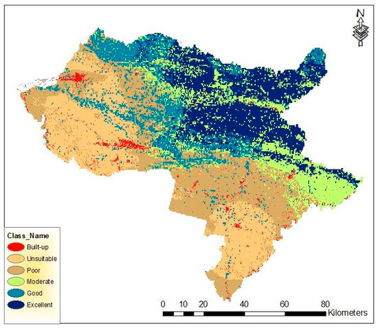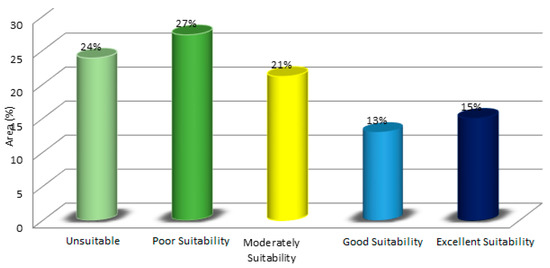 The research applies appropriate criteria for rainwater harvesting based on a review of the literature and is mindful of soil groups, rainfall depths, slope drainage areas, and a land use and land cover map. The suitable location for rainwater harvesting structures was developed with integrates of remote sensing and GIS-based on an Analytical Hierarchy Process (AHP) analysis, taking into account five layers. Rainwater harvesting suitability sites were determined using multi-criteria evaluation (MCE). Image satellite and DEM were derived to determine the land cover/use map, the slope map, the drainage map, and the soil map. A hydrological soil group map and four land use classes were prepared as well as all the criteria for the selection of a suitable location for rainwater harvesting. Five comparable units are used as indicators for potential sites for water harvesting (according to their suitability): excellent suitability, good suitability, moderate suitability, poor, and unsuitable. Figure 5 indicates that excellent suitability sites for water harvesting were concentrated in the northern part of the study area. The outcome indicated that 15% (2204 km2) and 13% (1377 km2) of the study area exhibited excellent and good suitability for water harvesting, while 21% (1506 km2), 27% (2842 km2), and 24% (2486 km2) of the site were classified as moderate, poor, and unsuitable according to Figure 6. It is clear that areas with a large excess of rainfall will have high appropriateness ranking; where this excess points to the availability of runoff to be gathered. The slope is a crucial limiting aspect to rainwater harvesting. The sites with a slighter slope were more suitable for rainwater harvesting; a small slope is required for enhanced runoff harvesting. Critchley and Siegert [32] suggested that an area with a slope of larger than 5% is unsuitable for water harvesting because of the rough runoff distribution and the great volume of earthwork required. The slope of the study area (Figure 2c) has been classified into four classes, as nearly level (0–3%), gentle slope (3–5%), moderate slope (5–8%), and strong slope (>10%). The northern part of the Dohuk governorate including Amedi, Zaxo, and Akre was identified as suitable areas for water harvesting, as it has been shown that these areas exhibit maximum rainfall rates (949 mm), as well as downstream sites of the watershed and dense hydrological networks with slopes less than 3. This led to the conclusion that the area is a suitable location for water harvesting (Figure 6).