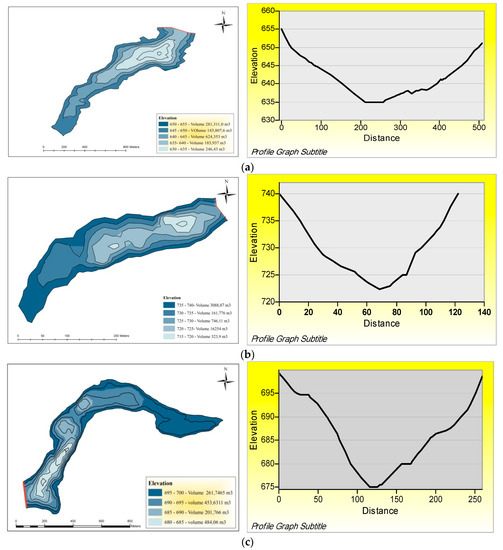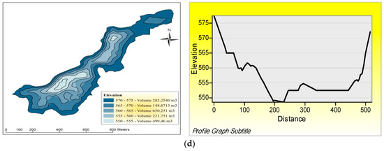 The northern part of the study site is the most complex in topography with deep drainage networking compared to the southern part, which contains plains or has moderate slopes with depthless drainage networks. The study identified nine potential sites for new dams. Four potential dams (No.1, No.2, No.3, and No.4) were evaluated by computed features from the TIN including a profile of the dam, the storage capacity, and the height of the dams (Figure 7). The volume of the dam depends on the storing and height of the dam. In addition, to demonstrate the correlation between the height of the dams and the storage capacity for harvesting water, four sites were considered as presented in Figure 8. The volume of water storage in the dams at each level was computed by the water level that reaches the top of the dam. These outcomes illustrate a strong relationship between the height of dams and the storing capacity; Figure 7 and Table 3 display the storage capability of the dam. The height of dam No.1 was 30 m, while dams No.2, No.3, and No.4 are envisaged to be 25 m. Ranking them according to their maximum storage capacity places them in the order: No.1, No.2, and No.3, followed by No.4 (Table 2). The profiles of the dams are based on the method described throughout this paper. Nevertheless, some of the proposed dam heights may not be feasible in practice because of some other factors such as the movement of material, or the dam’s width [25]. In addition to the five criteria used in this study, there are other criteria not considered in this study such as geology and socio-economic aspects [18].