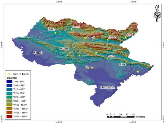 The study area covers the Dohuk Province in the far north-west of Iraq, situated at 36° 54’ 27.72” latitude, 43° 3’ 47.52” longitude, and 585 m above the sea level [29] (Figure 1). The Dohuk province was selected because of its importance, especially in terms of history and geography. The effects and sculptures discovered in the hills and covers demonstrate the significance of its geographical location, at the border of Iraq, Turkey, and Syria. The province of Dohuk is characterized by diverse terrains of high mountains and complexes. In addition, the plains are spacious and rich in agricultural resources. These are located in the south of the province. While the surrounding mountains have relatively high altitudes, the climate of the study area is related to the Mediterranean zone. In this climate, summer is characterized by a dry and hot climate with low moisture. In contrast, winter is characterized by lower temperatures, higher humidity, and reasonable rainfall as well as snowfall in the mountains. The spring seasons are characterized by cold temperatures as well as significant rainfall rates. The occasional dry season which lasts for longer periods of time leads to the undernourishment of the surface.
