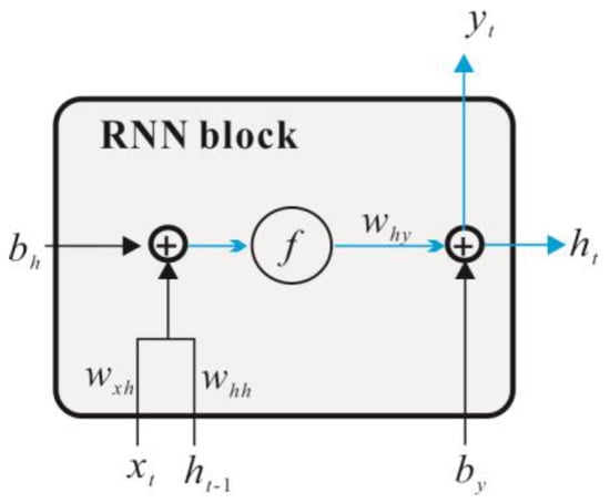 The RNN consists of an input layer, one or more hidden layers and an output layer (Figure 2). The hidden layer continuously recurrently trains the network according to the input time of the sequence (Figure 3). In this study, the neural network is a three-layer network structure. The input data X (x1, x2, …, xi, …, xn1) and output data Y (y1, y2, …, yk, …, yn3) are connected by the hidden layer H (h1, h2, …, hj, …, hn2), where n1, n2, and n3 represent the total number of inputs, hidden neurons, and outputs. The number of input layer and output layer nodes determined by the input and output data of the model. As an important parameter affecting the performance of the model, the number of hidden layer nodes is usually determined by a trial and error method in the training process. In this paper, the weight coefficient matrix is represented by W (for example, Wxh represents the weight coefficient matrix of the input layer to the hidden layer.), the offset vector is represented by b (bh represents the offset vector of the hidden layer), the activation function is represented by f(), and the learning and training process of the RNN neural network is as follows: