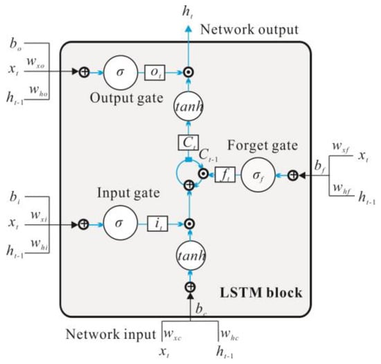 Although an RNN can effectively deal with nonlinear time series, there are still some problems: (1) due to the problems of gradient disappearance and gradient explosion, an RNN cannot capture the temporal features especially the long-term dependencies [22,23]. The training of RNN models need to determine the length of the input sequence in advance, but it is difficult to obtain the optimal value of this parameter in practical application. To solve these problems, the LSTM model was invented. The difference between the LSTM model and RNN model is that the RNN block in the hidden layer is replaced by the LSTM block. This enables modeling a long-term memory capability [24]. The LSTM block was obtained from Gers et al. [21], and it consists of an input gate, a memory cell, a forget gate, and an output gate, as shown in Figure 4. The corresponding forward propagation equations are presented below. The first step in our LSTM is to decide what data should be removed from the cell state. This decision is made by a sigmoid layer called the forget gate. The forget gate will generate an ft value between 0 to 1, based on the previous moment output ht−1 and current input xt to decide whether to let the information Ct−1 that is produced in the previous moment pass or partially pass, which is depicted by Equation (3):