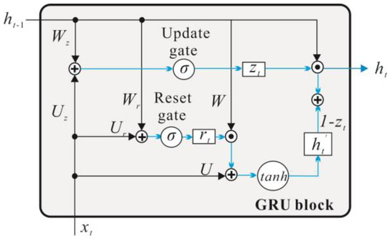 In Equations (8) and (11), z, r, h’, and h are the update gate, reset gate, hidden memory, and hidden output, respectively. Herewith, σ and tanh represent the gate activation function (the logistic sigmoid in this paper) and the hyperbolic tangent activation function, respectively. W and U represent the corresponding weight coefficient matrix.