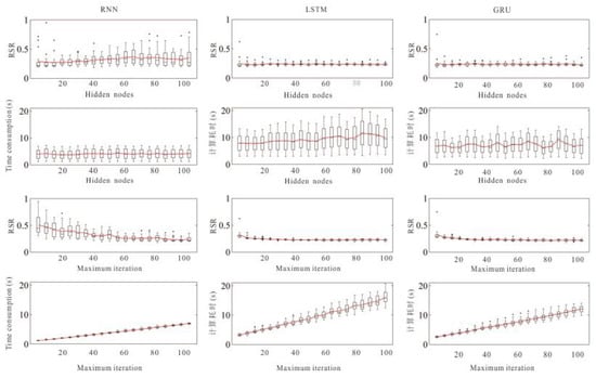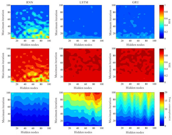 In detail, with respect to each model, the performance of RNN model is significantly influenced by the number of iterations and hidden nodes, and the accuracy of the model increases rapidly with the increase of iterations. When the number of iterations is greater than 60, the model is more likely to obtain high precision (Figure 5 and Figure 6). The influence of hidden nodes on the simulation accuracy and calculation speed is not obvious, however, the research results show that if the number of hidden nodes is less than 20, the required iterations for model convergence is fewer (Figure 5 and Figure 6). Compared to RNN models, the LSTM and GRU models are less affected by the number of iterations and hidden nodes. Meanwhile, the convergence speed and calculation speed of these two models are fast (Figure 5 and Figure 6). When the number of iterations is greater than 20, the model can obtain high precision prediction results (Figure 5 and Figure 6).