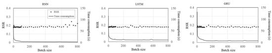 Second, we further explore the effect of the batch sizes on model accuracy and calculation speed (Figure 8). To ensure the high-precision prediction results of the model, we set the number of maximum iterations to 100 and the number of hidden nodes to 10 for all three models. As shown in Figure 8, the batch size mainly affects the calculation speed of the models. With the increase of the batch sizes the calculation speed of three models increases significantly. This has been proved by previous studies which have shown that batch sizes are the main factor that limits the computational speed of the models [28,32]. On the other hand, the effect of batch sizes on model precision is low. According to previous studies, the smaller the batch sizes the greater the randomness in one batch and the less likely the model is to converge. However, due to the large randomness, it is easy to obtain the global optimal value. On the contrary, the bigger the batch sizes the more features of data can be represented. Furthermore, the more accurate the gradient descent direction the faster is the model converges with the calculation speed of the models will be improved. However, the large batch size possesses a relative lack of randomness, and it is easy to keep the gradient falling in one direction and fall into the locally optimal solution.