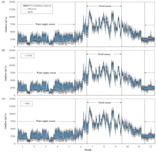 First, the simulation accuracy of each model is compared and analyzed. As suggested by Moriasi et al. [30], an RMSE value, which is less than half of the standard deviation of the observed data may be considered low. If RSR < 0.5 and NSE > 0.75, the model performance can be considered satisfactory, whereas an NSE value < 0.0 indicates that the mean observed value is the better predictor than the simulated value, which indicates unacceptable performance. Therefore, with respect to global accuracy, all three models can complete the prediction performance of reservoir outflow, and the comparison among three models shows that the global accuracy of LSTM model is higher than that of GRU and higher than that of RNN, but the difference is low (Figure 9, Table 2). In addition, for the flood season, the best accuracy of models rank as LSTM > GRU > RNN. Herewith, during the water supply season, the best accuracy of models rank as LSTM > RNN > GRU. Meanwhile, the difference test of multiple simulation results of the model showed no significant difference (Figure 9, Table 2).