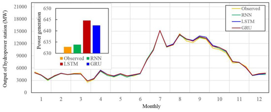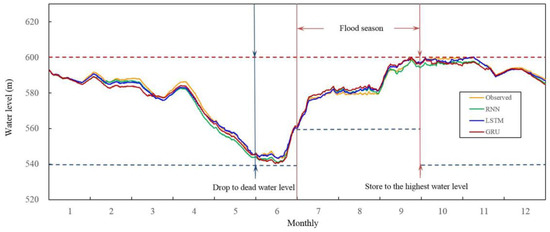 In addition to the requirement for model performance, the reservoir operating model should also meet the reservoir operating rules and possess the comprehensive benefits of the reservoir. Given that the main operating obtain of XLD hydropower is flood control and power generation, this paper focuses on the flood control and power generation benefits of the reservoir operating models. As shown in Figure 10, according to the rules of XLD hydropower station, the water level of the reservoir should be between the dead water level of 540 m and the normal highest water level of 600 m. During the flood season (from 1 July to 30 September), the normal water level should be between the limited flood water level of 560 m and the normal highest water level of 600 m. From October to November, the reservoir keeps the operation at a high-water level. Starting from December, the reservoir operates at a water supply season, and the water level should be gradually decreased. The water level at the end of the water supply season (the end of May) should not be lower than the dead water level. Our research results show that the simulation results of the selected three deep learning networks can meet the water level limitation requirements of XLD reservoir under different operating seasons and implements the flood control and water supply functions of the reservoir (Figure 10).