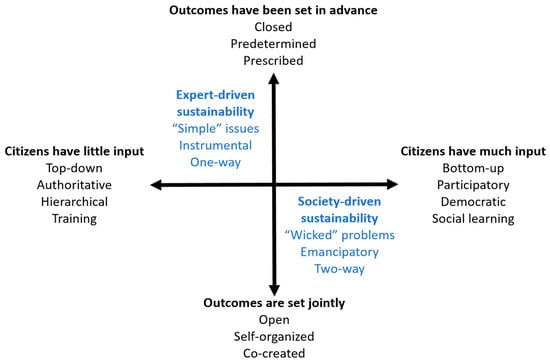 This wheel of participation resembles a heuristic (i.e., a tool to promote discussion) developed in the context of education for sustainability by Jickling and Wals [], who distinguish processes by what we consider to be the same dimensions. They refer to the “bottom-up/top-down” dimension as the degree of authority vs. participation, and the “one-way/two-way” dimension as the extent to which outcomes are fixed (i.e., predetermined to a transmissive end) vs. open (i.e., emergent, jointly established to a socio-constructivist end) (Figure 1). They refer to the former as more instrumental and the latter as more emancipatory. In other terms, one can define “society-driven” processes as processes in which multiple perspectives are represented (implicitly involving many stakeholder groups and citizens) and that are co-designed.