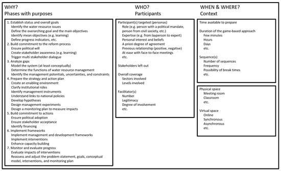 Game-based approaches in the “society-driven sustainability” corner (Figure 1, lower right) deal with relatively poorly structured issues that have relatively high dissonances and distances physically, normatively, or both. Few precedents or examples of how a game-based approach might support these cases exist. In “wicked” contexts, issues are often nexus issues: They go well beyond technical water management issues, including phenomena such as boundary-crossing, co-creation of knowledge, and dealing with emergence and associated uncertainty. The question is whether game-based approaches can help within such a “messy” environment, and if so, what kind of game-based approaches and characteristics might work in such contexts. In particular, how do designers transfer the variables of purpose and outcomes (“why” in the variance approach) and of people and processes (“why” in the process approach) (Figure 4) into the game’s design and technical aspects (“how”) (Figure 5).