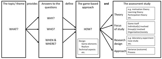 We argue that combining answers to the questions “why”, “who”, and “where and when” will help to (a) design the most effective game-based approach to reach the targeted outcomes and (b) assess the game-based approach, adequately monitoring the achievement of the targeted outcomes (Figure 3). In particular, answers to the “why” question guide the choice of the theoretical background to use to design and assess the game-based approach. Answers to the “who” question influence the focus of study: The game itself, the individuals involved, the groups involved, or the organization/society. Combining the answers to the “why” and “who” questions fully determines the focus. Combining answers to the “when and where” and “why” questions determines the research design (i.e., the methodological plan to collect assessment data). In certain spatial and temporal contexts, qualitative inquiry may be more appropriate than quantitative assessment.