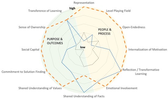 Similar to the goal of Dillon et al. [], the point of positioning the SI papers in a heuristic (Figure 2, Figure 4, and Figure 5) is not to describe them precisely. Instead, it is meant to invite deeper and more thorough discussion about the parameters and dimensions that underlie water governance and help determine the types of game-based approach that may best address or overcome the given water governance challenge. For instance, designers can use a radar chart (Figure 4) to map the starting position of all variables of purpose and outcomes in a given context and then use another radar chart (Figure 5) to translate their agreed-upon configuration into a specific corresponding game design. Game designers may need to find a design (Figure 5) that builds trust between stakeholders who may not trust each other, find a way to arrive at a common language to discuss the issue at hand, or develop game mechanisms that can help participants deconstruct and reconstruct their worldviews and frame the issue–together. Future research could focus on how stakeholders can agree upon how to position or assess each variable represented in the heuristic. The game-based approach will also need to find a way to (a) address emergence and the iterative nature of reflection and co-creation, and (b) treat goals and knowledge as tentative, being subject to revision based on ongoing critical and collaborative dialogue, inquiry, and action.