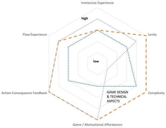 Heuristic representation of variables of game design and technical aspects for three hypothetical game-based approaches.