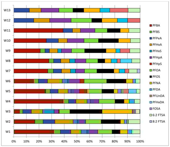 - Möller, A.; Ahrens, L.; Surm, R.; Westerveld, J.; van der Wielen, F.; Ebinghaus, R.; de Voogt, P. Distribution and sources of polyfluoroalkyl substances (PFAS) in the River Rhine watershed. Environ. Pollut. 2010, 158, 3243–3250. [Google Scholar] [CrossRef] [PubMed]