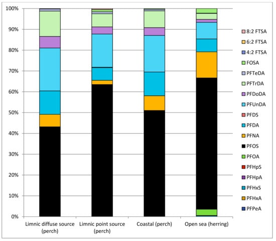- Faxneld, S.; Danielsson, S.; Nyberg, E. Distribution of PFAS in Liver and Muscle of Herring, Perch, Cod, Eelpout, Arctic Char, and Pike from Limnic and Marine Environments in Sweden; Swedish Museum of Natural History: Stockholm, Sweden, 2014. [Google Scholar]