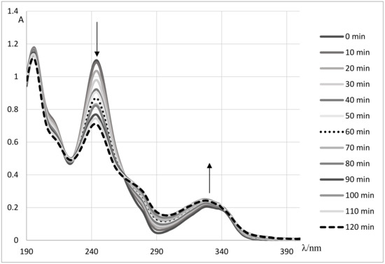 At the beginning of the performed experiments, a UV spectrum of doxazosin aqueous solution was recorded. Its spectral characteristics possessed three distinct maxima: sharp and intense at 196 and 246 nm, and broad and less intense at 328 nm (Figure 2). The kinetics of doxazosin decay was observed by monitoring the changes at 246 nm.